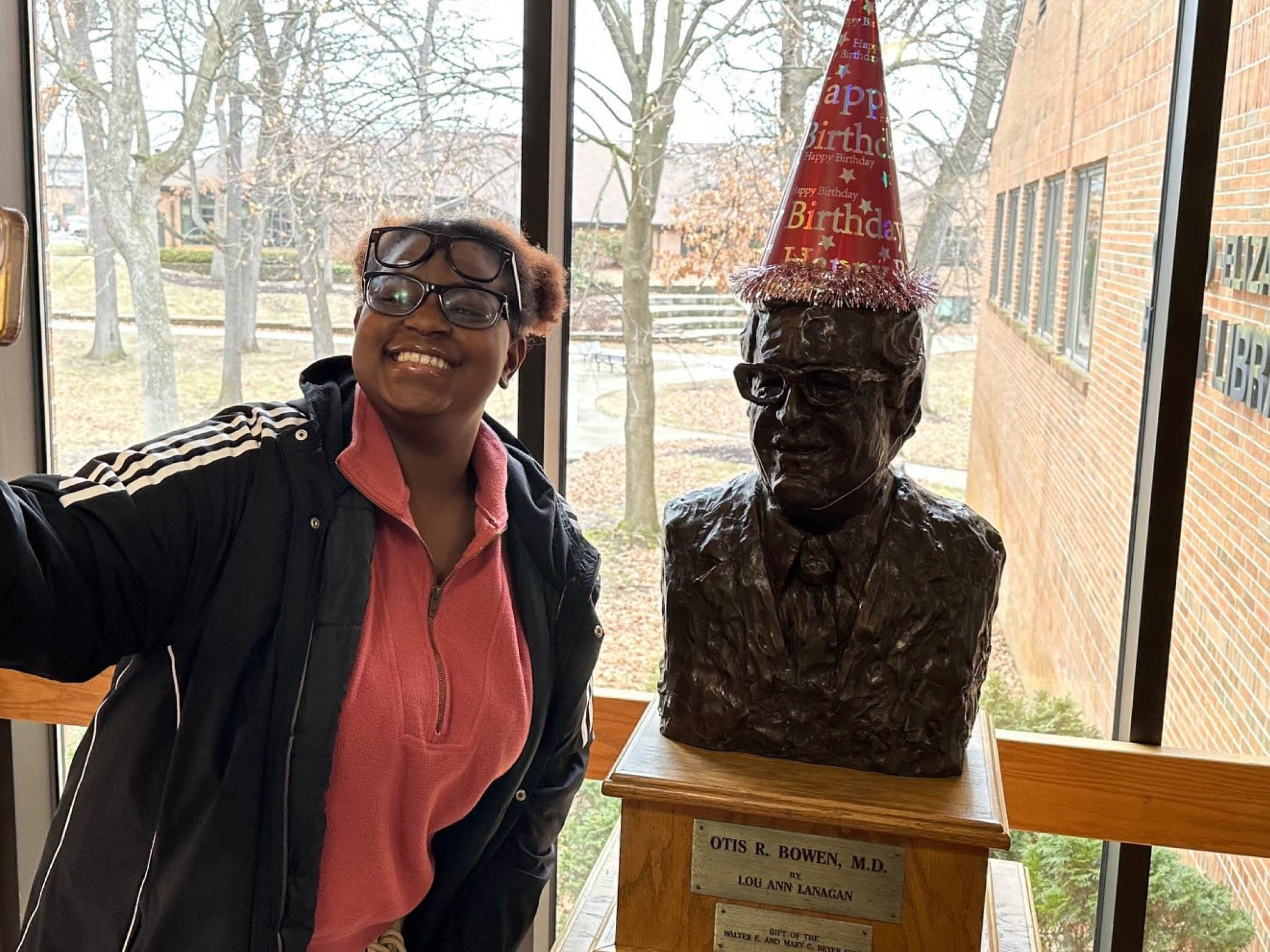 Bethel University celebrated the birthday of former Governor of Indiana Dr. Otis R. Bowen at the “Bowen Birthday Bash” on Wed., Feb. 26, 2025, in the Bowen Museum, located in the Otis and Elizabeth Bowen Library building on Bethel’s campus. The event, primarily for Bethel students, was designed to generate interest in the Bowen Museum, which houses artifacts from Dr. Bowen’s life – from his early years, to his career as an obstetrician, to his tenure as governor of Indiana (1973-1981) and Secretary of Health and Human Services under President Ronald Regan (1985-1989). Dr. Bowen passed away on May 4, 2013. This year would have marked his 107th birthday.