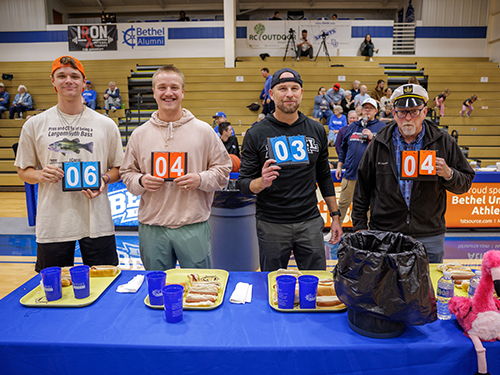 We celebrated our Homecoming during the Inauguration Weekend. On November 14, 2025, we hosted an “Into the Woods” character dinner, featuring some of the main characters from the fall musical. November 15, was Hoops and Hot Dogs, where alumni enjoyed free admission and hot dogs during our men’s and women’s basketball games. Halftime included a hot dog eating contest with student Carter Hunt, Resident Director Trent Parmley, Athletic Director Jason Lewkowicz and Professor Dave Schmidt; Hunt was the victor.